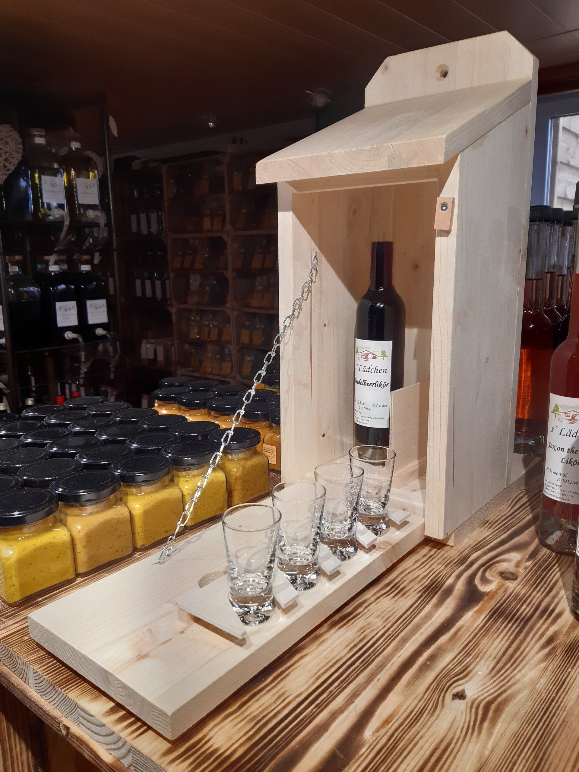 Dieser "Zwitscherkasten" beinhaltet 4 Schnapsgläser und bietet im Inneren Platz für eine Flasche Likör oder Schnaps.